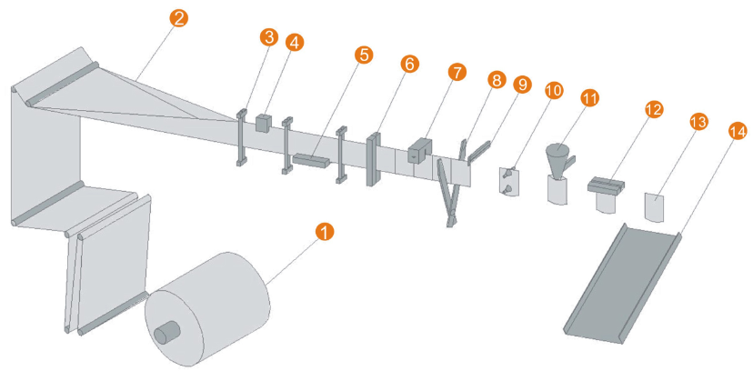 1. 放膜機構(gòu) 2.包裝膜成型 3. 包裝膜導(dǎo)向 4. 色標(biāo)檢測5. 底封機構(gòu) 6. 豎封機構(gòu) 7.易撕口裝置 8. 剪切機構(gòu) 9. 牽袋機構(gòu) 10. 開袋機構(gòu) 11. 充填 12. 上封 13. 成品 14. 成品輸出