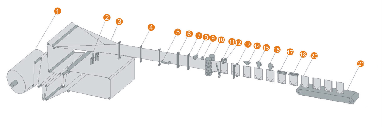 1. 放膜機構(gòu) 2. 底部沖孔 3.包裝膜成型 4. 包裝膜導(dǎo)向 5. 底封機構(gòu) 6. 豎封機構(gòu)I 7. 豎封機構(gòu)II 8.易撕口裝置 9.色標(biāo)檢測 10. 伺服牽袋 11. 剪切機構(gòu)  12. 夾袋 13. 開袋機構(gòu) 14. 吹氣裝置  15. 充填I(lǐng)  16. 充填I(lǐng)I  17. 上封I   18. 上封II   19. 成品 20. 成品輸出 21.輸送