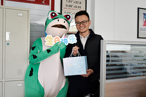 每走到一個部門,青蛙玩偶都會引來一陣陣歡笑和驚嘆。它笨拙而又可愛地跳躍著,手中緊握著為每位壽星量身定制的小禮物,從精美的文具套裝到實用的生活用品,每一份禮物都蘊含著公司對員工個人喜好的細心關注與尊重。收到禮物的同事們臉上洋溢著驚喜與感動的笑容,這份意外的驚喜讓他們感受到了家一般的溫暖。