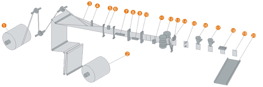 1.放拉鏈機(jī)構(gòu)  2. 放膜機(jī)構(gòu)  3.包裝膜成型 4. 拉鏈導(dǎo)向  5. 包裝膜導(dǎo)向 6. 色標(biāo)檢測   7. 上封拉鏈 8. 豎封拉鏈機(jī)構(gòu)I 9. 底封機(jī)構(gòu) 10. 豎封機(jī)構(gòu) 11.易撕口裝置 12. 伺服牽袋 13. 剪切機(jī)構(gòu)  14. 夾袋 15 開袋機(jī)構(gòu) 16. 充填I(lǐng)  17. 充填I(lǐng)I  18. 上封  19.. 成品 20. 成品輸出