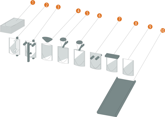 1.預制袋疊放 2. 翻轉(zhuǎn)取袋機構(gòu) 3. 開袋機構(gòu) 4. 吹氣機構(gòu) 5. 一次灌裝 6. 二次灌裝 7. 展袋 8. 上封 9. 成品 10. 成品輸出