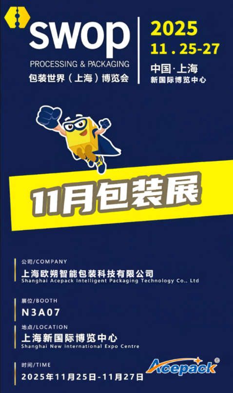 2025 年 11 月 25 日 - 27 日,上海新國(guó)際博覽中心 N3A07 展位,上海歐朔與您相約 swop 2025,共赴包裝盛宴,共繪智能包裝新藍(lán)圖!期待您的蒞臨,不見(jiàn)不散!