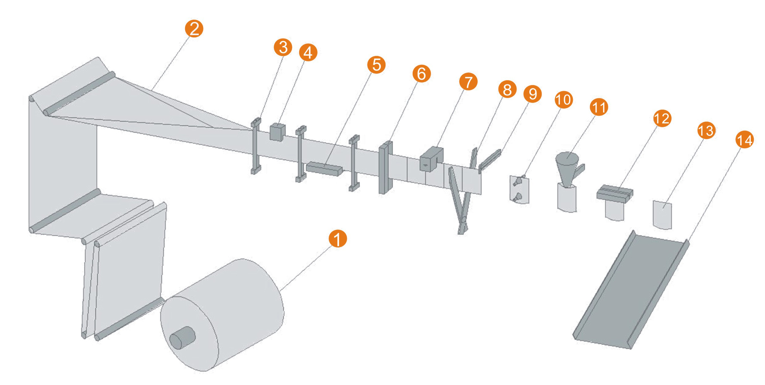 1. 放膜機構 2. 包裝膜成型 3.包裝膜導向 4. 色標檢測 5. 底封機構 6. 豎封機構I 7. 易撕口裝置 8.剪切機構 9.牽袋機構 10. 開袋機構 11. 充填機構  12. 上封機構 13. 成品 14. 成品輸出