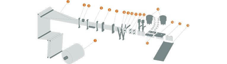 1 放膜機構 2 包裝膜成型 3 包裝膜導向 4色標檢測 5 底封機構 6 豎封機構I 7 豎封機構II 8 剪刀機構I 9 剪刀機構II 10 色標檢測 11 牽袋機構 12 開袋機構 13 填充裝置 14 震動加嘴 15 加嘴機構16 上封機構 17 成品 18 成品輸出
