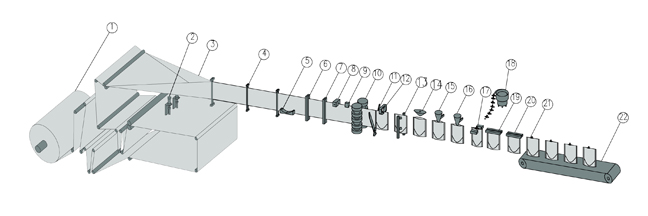 1. 放膜機(jī)構(gòu) 2. 底部沖孔 3.包裝膜成型 4. 包裝膜導(dǎo)向 5. 底封機(jī)構(gòu) 6. 豎封機(jī)構(gòu)I 7. 豎封機(jī)構(gòu)II 8.易撕口裝置 9.色標(biāo)檢測(cè) 10. 伺服牽袋 11. 剪切機(jī)構(gòu) 12. 夾袋 13. 開袋機(jī)構(gòu) 14. 吹氣裝置 15. 充填I 16. 充填II 17. 加嘴裝置 18. 封嘴裝置 19. 上封I 20. 上封II 21. 成品 22. 成品輸出